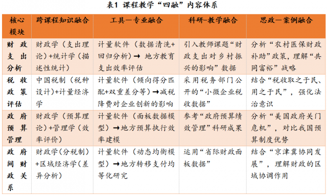 围绕课程四大财税模块,通过“跨课程知识融合、工具-专业融合、科研-教学融合、思政-案例融合”打破内容壁垒,形成“多维度融合”教学内容体系。具体如下表所示: